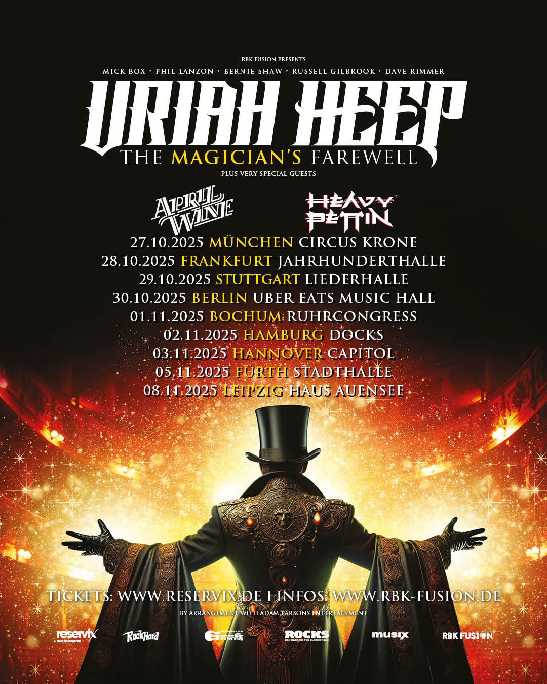 URIAH HEEP sind stolz darauf, die Europa-Etappe der „The Magician’s Farewell“-Tour im Oktober/November 2025 anzukündigen. Die Tour wird 9 Shows in Deutschland umfassen, um einen der wichtigsten britischen Rockacts aller Zeiten zu feiern. Weitere Termine in Europa werden in Kürze bekannt gegeben.