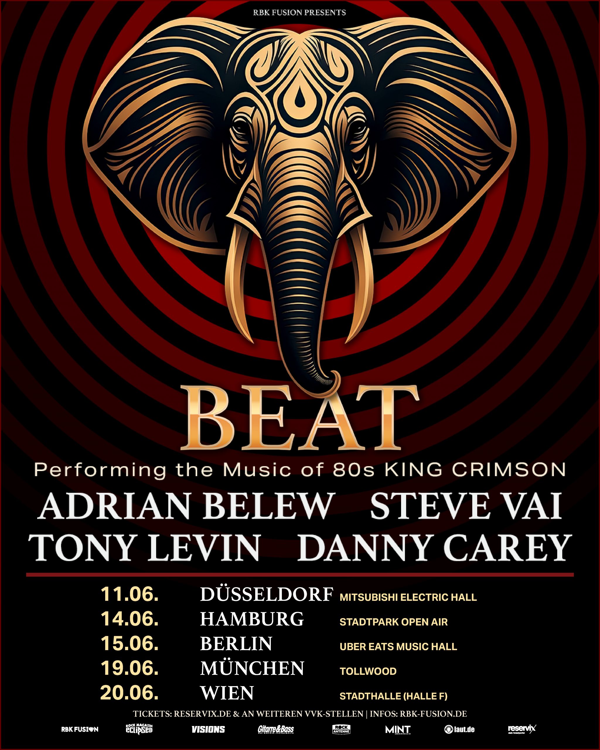 Die ehemaligen King Crimson-Mitglieder ADRIAN BELEW und TONY LEVIN schlossen sich mit dem Gitarrenvirtuosen STEVE VAI und dem explosiven Tool-Schlagzeuger DANNY CAREY zusammen, um BEAT zu gründen, eine kreative Neuinterpretation der drei legendären KING CRIMSON-Alben aus den 80er Jahren – Discipline, Beat und Three Of A Perfect Pair. Im Jahr 2024 gab das Ensemble 65 ausverkaufte Konzerte in Nordamerika, gefolgt von Auftritten in Mexiko, Südamerika und Tokios legendärem Budokan.Fans in Europa haben lange auf die Pläne der Band gewartet, Auftritte in Großbritannien und auf dem gesamten Kontinent zu veranstalten.